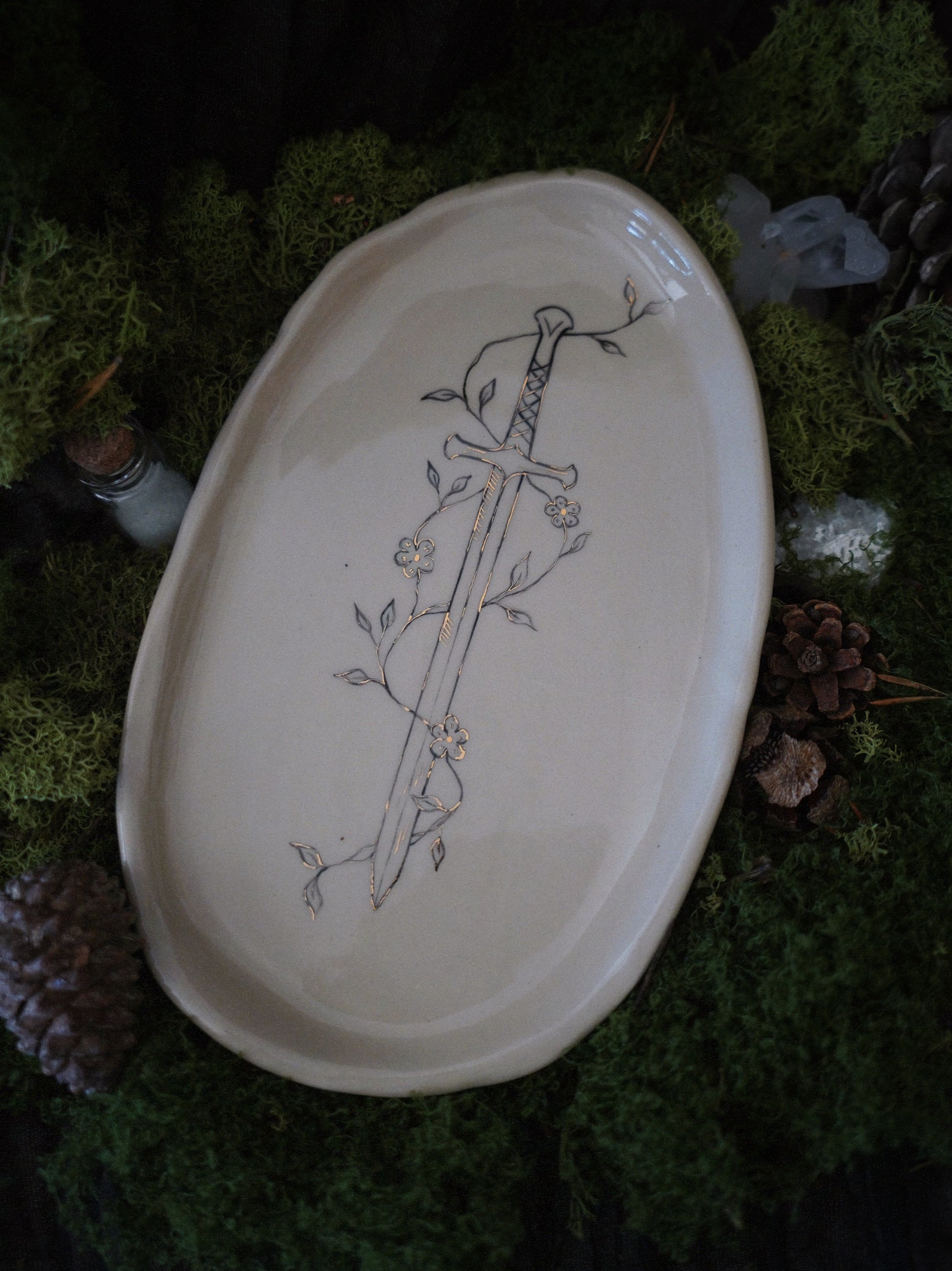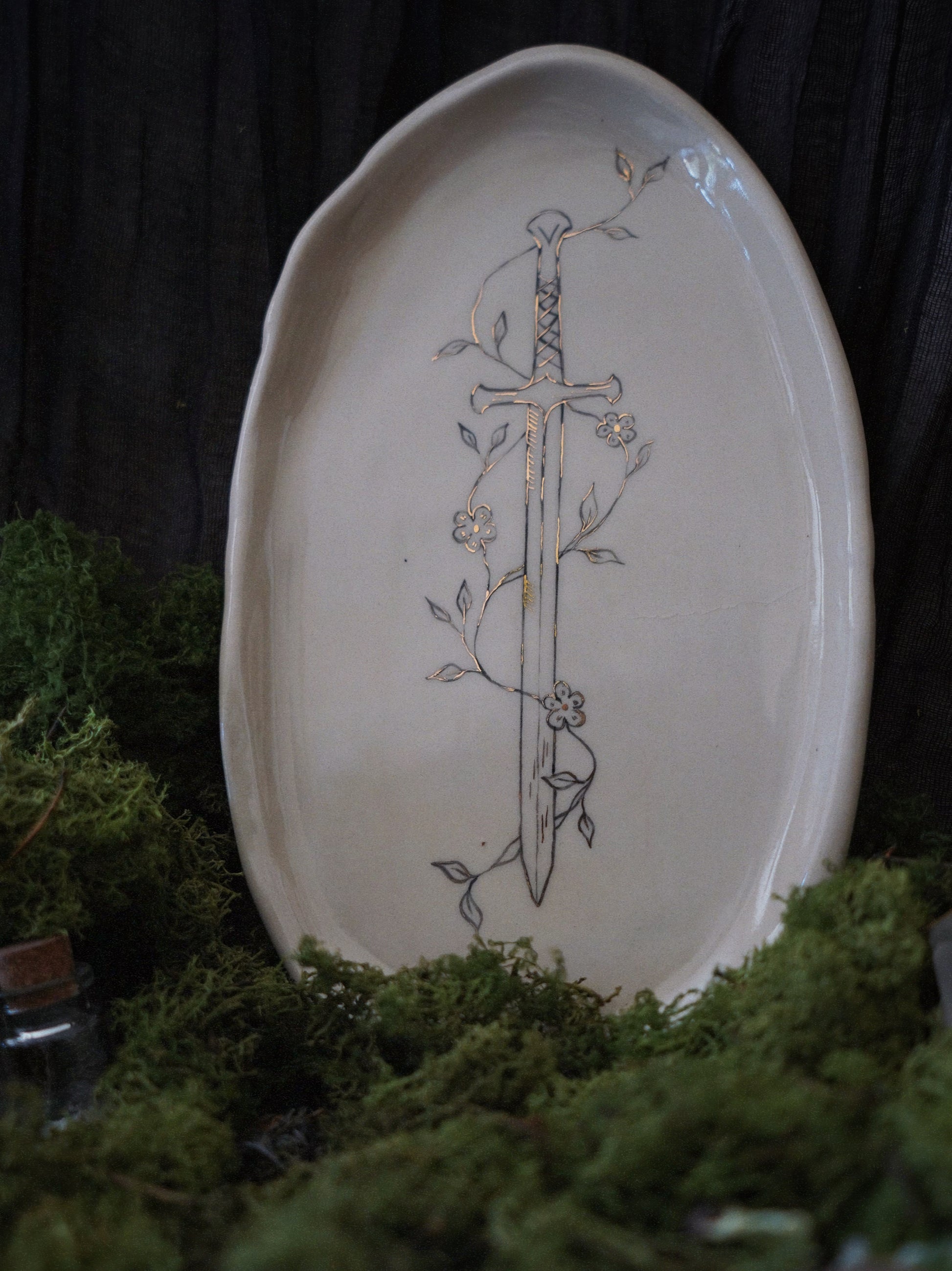 Handmade stoneware dish with a hand-drawn sword and real gold accents.